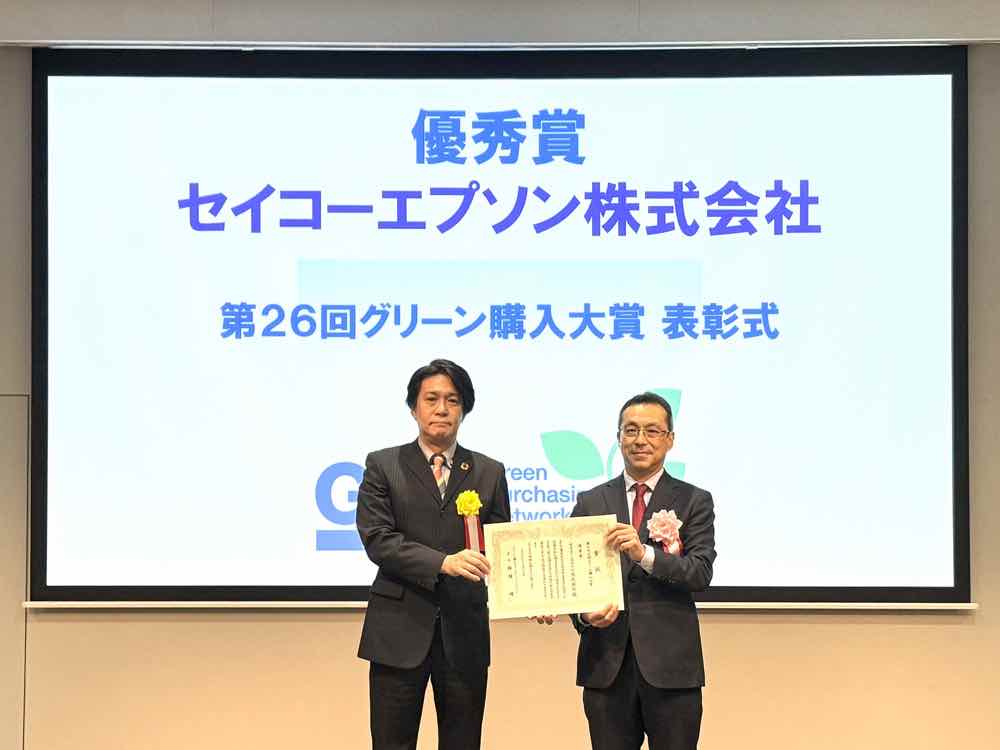 セイコーエプソン(以下 エプソン)は、グリーン購入ネットワークが主催する、「持続可能な調達」を通じてグリーン市場の拡大に貢献した取り組みやSDGsの目標達成に寄与する取り組みを表彰する「第26回グリーン購入大賞」において、大企業部門で「優秀賞」を受賞した。表彰式は、12月17日にコングレスクエア日本橋(東京都中央区)にて開催された。
