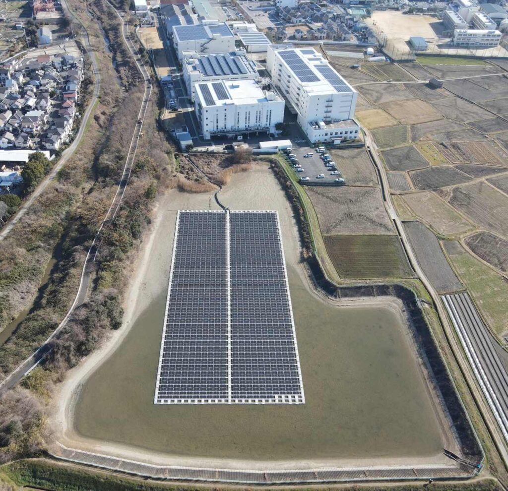 枚方工場では、これまで、工場建屋の屋上に太陽光発電設備を設置するなど再生可能エネルギーの導入を進めてきたが、発電容量の拡大に伴い、設置場所の新たな確保が課題となっていた。水上設置型太陽光発電設備は、ため池の水面を有効活用することで、新たに土地を造成して設置する地上設置型に比べて、大規模な造成や土地改変を伴わずに設置でき、環境負荷を低減できることが特徴である。