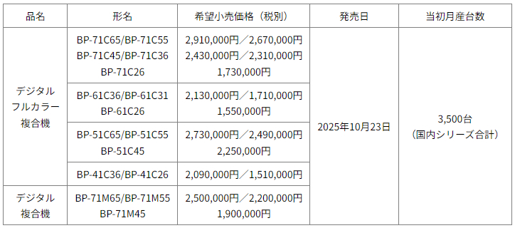 新製品は、カラー複合機が、A4両面300ページ/分の高速スキャンが可能で複写速度(A4ヨコ)65枚/分の「BP-71C65」など、複写速度65枚/分から26枚/分まで13機種。モノクロ複合機は、複写速度(同)65枚/分、55枚/分、45枚/分の3機種。