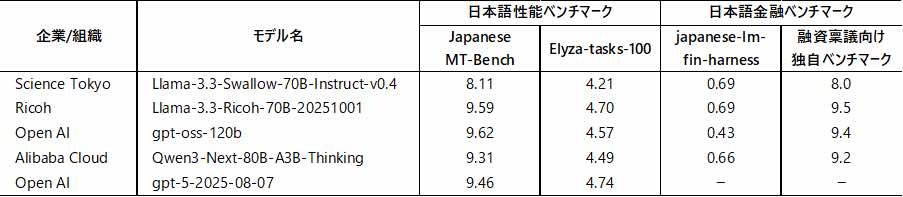 複雑な指示やタスクを含む代表的な日本語ベンチマーク「ELYZA-tasks-100」、日本語のマルチターンの対話能力を評価する「Japanese MT-Bench」、日本語金融ベンチマーク「japanese-lm-fin-harness」、および金融業向けに独自開発したベンチマークにより、性能を評価した。その結果、リコーが開発した「金融業務特化型LLM」は、日本語ベンチマークにおいて米OpenAI社のGPT-5と同等レベルの高いスコアを示した。また、金融ベンチマークではパラメータ数が同規模以上の最先端オープンソースモデルを上回るスコアを示した。